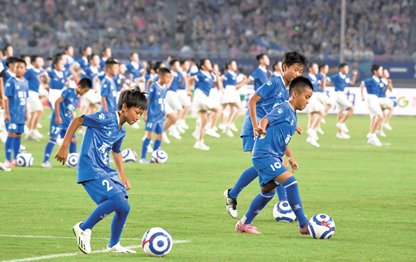 图为南京部分足球特色学校的学生们在“苏超”赛场上进行足球展演