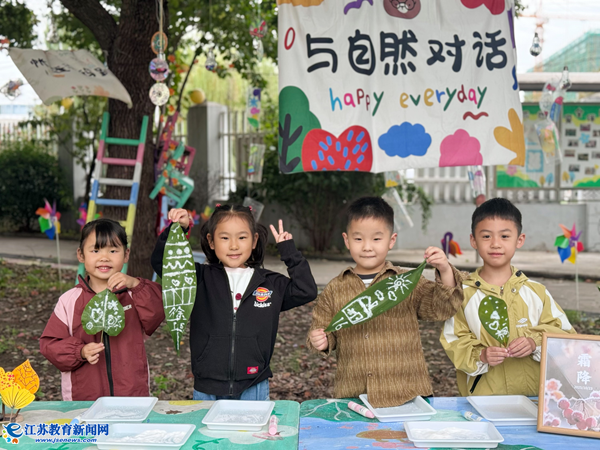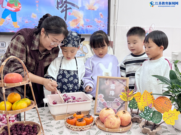 江苏教育新闻网讯 (通讯员 沈晶)10月22日,为了迎接霜降节气的到来,扬州市生态科技新城杭集镇镇北幼儿园以“霜降物候”为主题,开展沉浸式节气实践活动。孩子们变身“自然探索家”,捡拾落叶,观察“霜打百草枯”的变化;用彩泥给树枝裹“白霜”,模拟霜景创作;和老师一起制作糖霜山楂,给山楂穿上晶莹的“糖衣”。孩子们在观察与体验中,感知霜降节气的特点。
