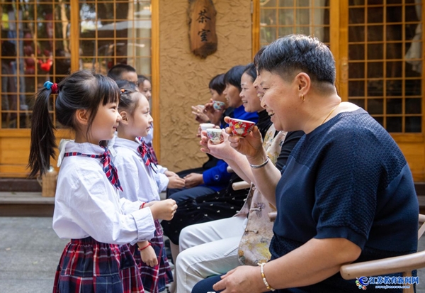 活动现场茶香氤氲。茶艺师端坐茶桌前,娴熟演示温杯、投茶、注水、分茶等全套茶艺流程。孩子们目不转睛,认真学习敬茶礼仪,随后小心翼翼端起冲泡好的菊花茶,递到身旁爷爷奶奶手中。温热的茶汤搭配稚嫩的问候,瞬间温暖了祖辈的心。期间,张家港市南沙小学学生还主动分享菊花茶的历史渊源与药用价值,让大家在沁人茶香中收获知识。