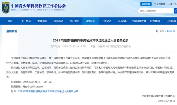 近日,中国青少年科技教育工作者协会官网发布《2025年高级科技辅导员专业水平认证拟通过人员名单》,江苏省共有14位青少年科技辅导员凭借扎实的专业素养、丰富的实践经验及突出的育人成效,成功通过本次高级认证。据悉,江苏省通过高级辅导员的总人数位列全国第一。