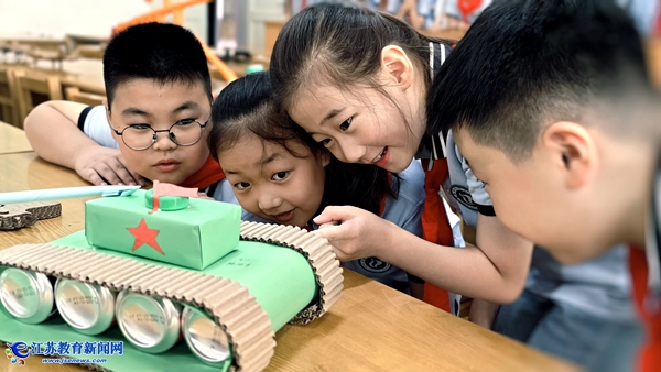 阅兵仪式结束不久,学校组织学生参观了由学生自己利用废旧物品制作的兵器展。这些兵器展品创意十足,同学们用废旧材料制作的坦克、飞机、大炮等模型,不仅是手工创意的展示,而且是对强国强军梦想的童真诠释。